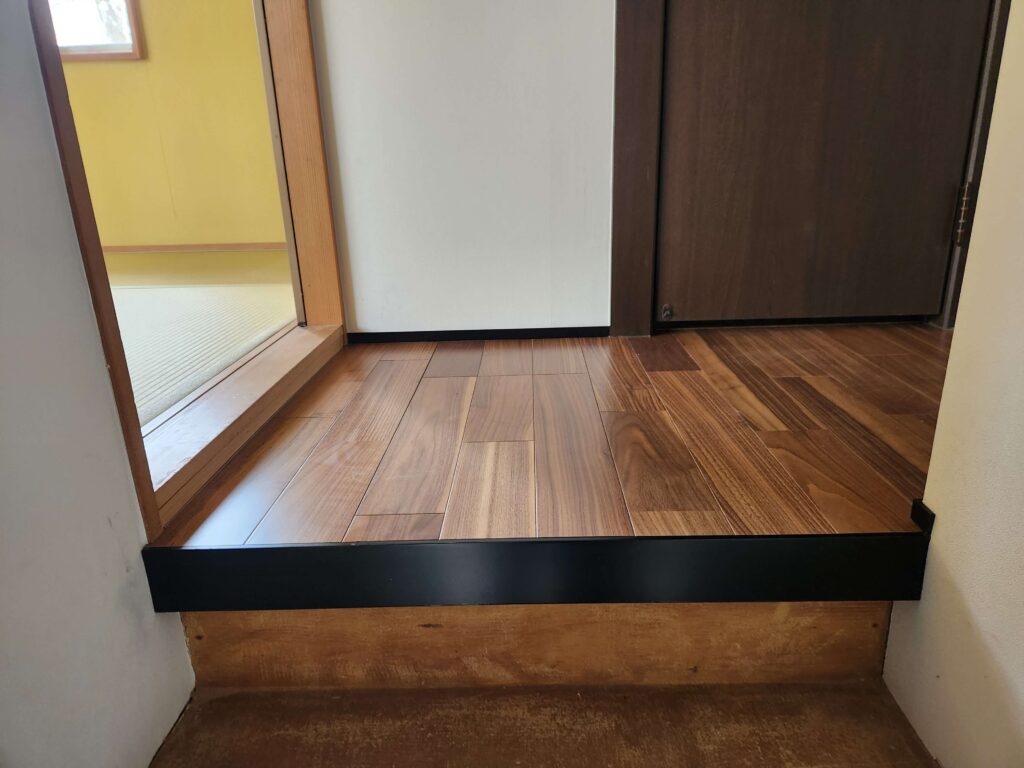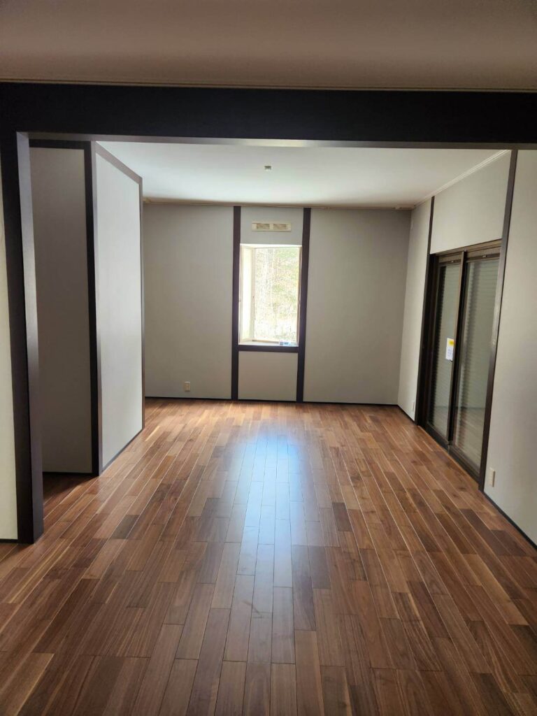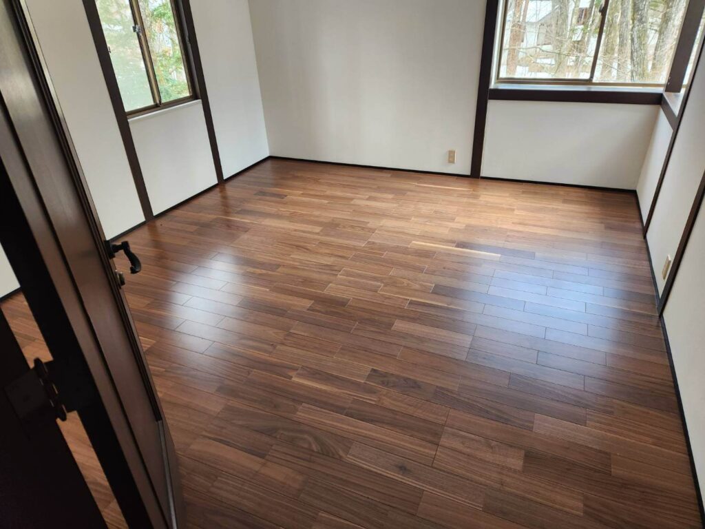 室内は、年季を感じさせる絨毯を撤去し、ウォールナットの突板フローリングを施工。
