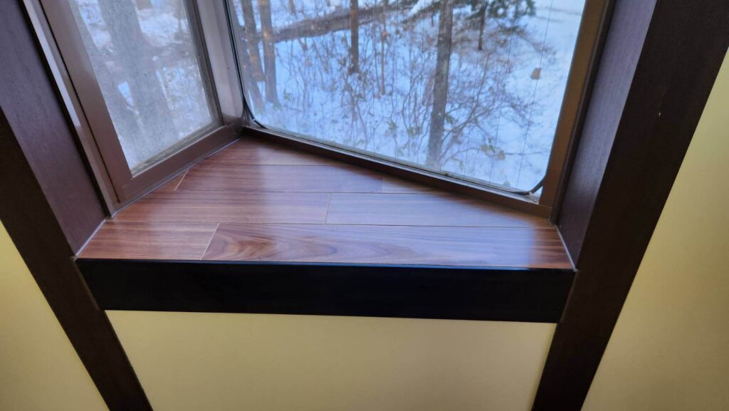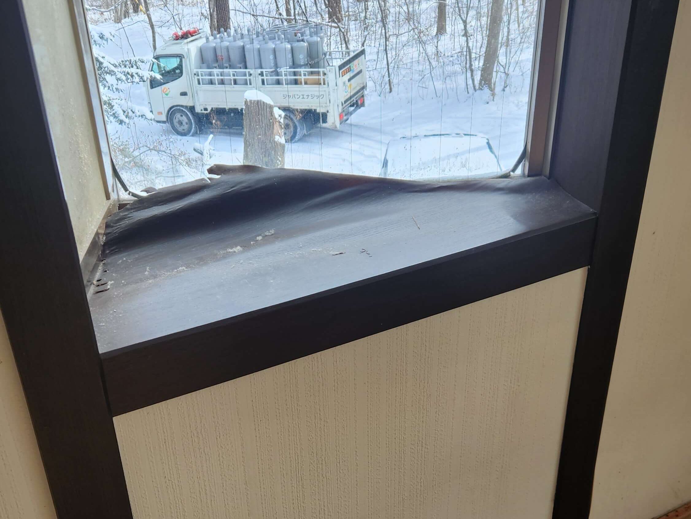 窓辺で結露により傷んでいたカウンターも、余材のフローリングを活用して美しく再生。